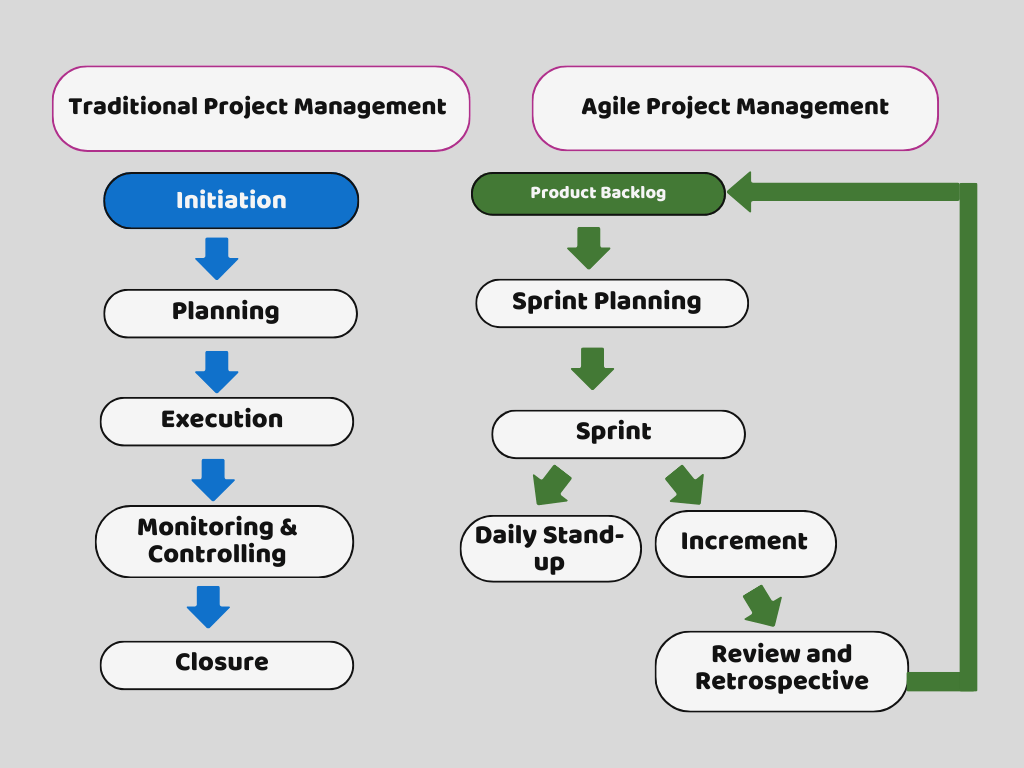 There are a lot of project management methodologies, but for the sake of this blog, we will focus on the traditional project management approach and the agile methodology. Traditional project management often involves extensive planning and a rigid, linear process that can take a long time to complete. This approach typically includes distinct phases such as initiation, planning, execution, monitoring & controlling, and closure. Each phase must be completed before moving on to the next, which can make it difficult to accommodate changes once the project is underway.